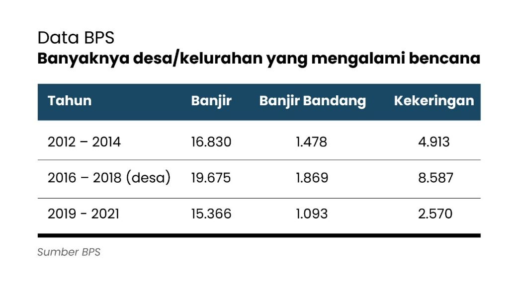 Data Badan Pusat Statistik di atas mencatat, dalam kurun 2019-2021, ada 15.366 desa/kelurahan mengalami bencana banjir. Atau sekitar 18% dari total desa/kelurahan di Indonesia. Lalu sebanyak 1.093 desa/kelurahan atau sekitar 1,3% mengalami banjir bandang.