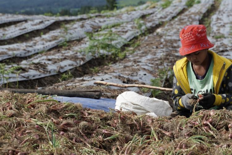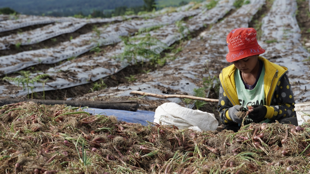 Warga sedang membersihkan bawang merah hasil panen di food estate Desa Ria-Ria, Kabupaten Humbang Hasundutan./Foto: Auriga Nusantara