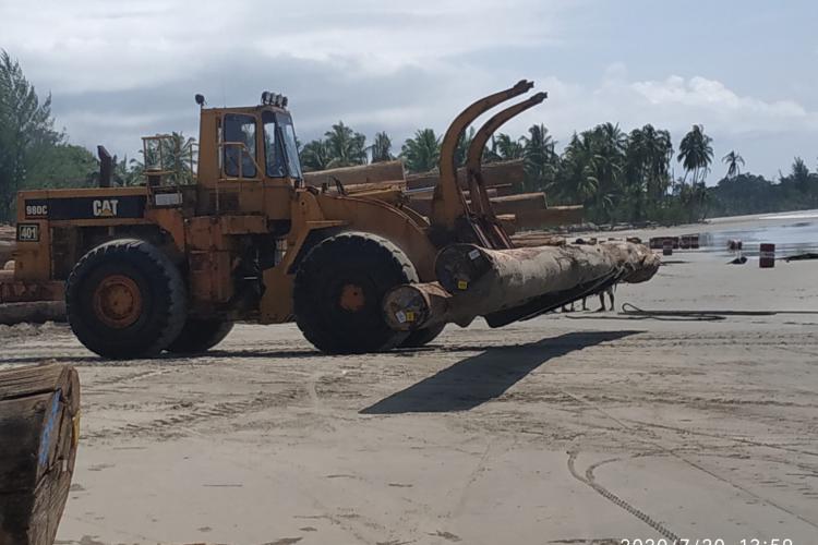 Kami tiba di Kampung Tiniti siang hari. Di tepi pantai, kami melihat dengan jelas tumpukan kayu-kayu gelondongan berukuran besar dari pohon Meranti (Shorea spp) dan Kruing (Dipterocarpus sp). Masing-masing panjangnya 10 meter. Menumpuk dalam gunungan yang tinggi. Bahkan ada kayu glondongan berdiameter satu meter.